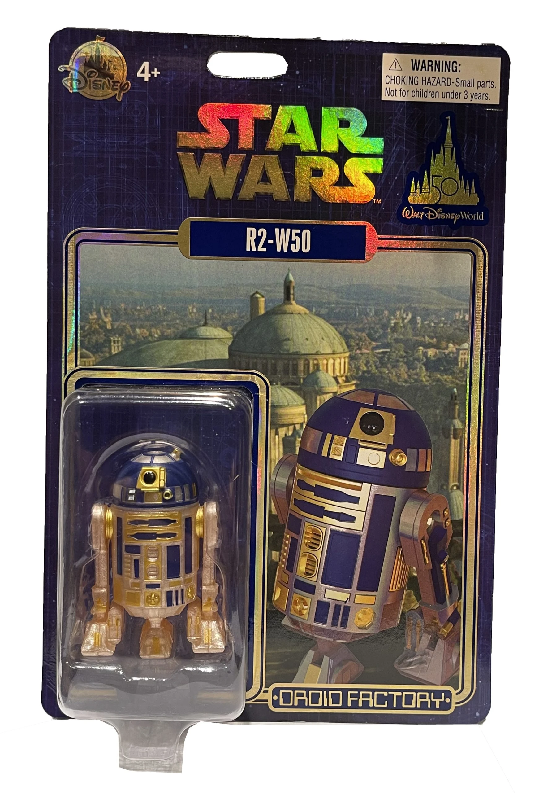 Enjoy a a product of the Droid Factory, with this 50th Anniversary droid. With the name R2-W50 with gold and blue color scheme, he brings a slightly sinister vibe to the galaxy.